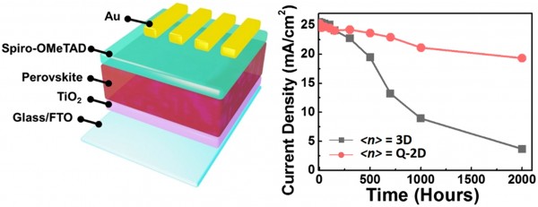In this work, we developed the perovskite photodiodes based on the dimensionality-reduced quasi two-dimensional (Q-2D) photoactive layer structure by incorporating phenylethylammonium iodide (PEAI) into methylammonium lead iodide (MAPbI3), which effectively enhanced both the crystalline phase and the ambient stability of the perovskite. The Q-2D perovskite photodiode exhibited a dark current of 1.76 × 10−7 A/cm2, resulting in the detectivity (D*) of 2.20 × 1012 J and responsivity of 0.53 A/W, which is among the highest performance levels without the voltage bias (0 V) due to the systematically optimized perovskite phase resulting in the reduced leakage current. In addition, the current density of Q-2D perovskite photodiode maintained 76% of the initial level current density even after 80 days in the ambient condition, compared to 15% of 3D perovskite photodiode control sample. Such superior performance and stability were mainly attributed to the enhanced degree of crystallization of the Q-2D perovskites, which was confirmed by X-ray diffraction and grazing incidence wide-angle X-ray scattering (GIWAXS) measurement. Also, the improved stability of Q-2D perovskite films was confirmed by both lifetime test and atomic force microscopy studies where the negligible number of pinholes was observed in the quasi-2D perovskite films while considerable deformations were found in the 3D perovskites photodiode. Our study suggests a simple and robust protocol for the development of stable and high-performance perovskite photodetectors via dimensional and constitutional optimization of conventional perovskites for the practical usage of perovskite in the photodiode applications.