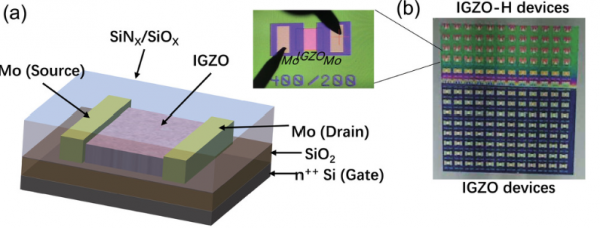 For newly developed semiconductors, obtaining high-performance transistors and identifying carrier mobility have been hot and important issues. Here, large-area fabrications and thorough analysis of InGaZnO transistors with enhanced current by simple encapsulations are reported. The enhancement in the drain current and on–off ratio is remarkable in the long-channel devices (e.g., 40 times in 200 µm long transistors) but becomes much less pronounced in short-channel devices (e.g., 2 times in 5 µm long transistors), which limits its application to the display industry. Combining gated four-probe measurements, scanning Kelvin-probe microscopy, secondary ion mass spectrometry, X-ray photoelectron spectroscopy, and device simulations, it is revealed that the enhanced apparent mobility up to several tens of times is attributed to the stabilized hydrogens in the middle area forming a degenerated channel area while that near the source-drain contacts are merely doped, which causes artifact in mobility extraction. The studies demonstrate the use of hydrogens to remarkably enhance performance of oxide transistors by inducing a new mode of device operation. Also, this study shows clearly that a thorough analysis is necessary to understand the origin of very high apparent mobilities in thin-film transistors or field-effect transistors with advanced semiconductors.