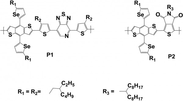 This work reports on the synthesis and characterization of two novel conjugated polymers consisting of selenophene substituted benzo[1,2-b:4,5-b′]dithiophene (SeBDT) donor, and dithienothiadiazole[3,4-c]pyridine(DTPyT)-P1 or thieno[3,4]pyrroledione(TPD)-P2 acceptors. The synthesized polymers are characterized for the significant photophysical prerequisites essential for organic electronics such as strong and broad optical absorption, thermal stability, and compatible highest occupied molecular orbital (HOMO) and lowest unoccupied molecular orbital (LUMO) levels. The polymers are thermally stable up to 280–370 °C, and the optical band gaps for P1, P2 calculated from their film absorption edges are found to be 1.53 and 1.84 eV, respectively. In addition, the electrochemical studies of P1, P2 reveal the HOMO and LUMO energy levels of −5.02,-5.04 eV, and −3.49, −3.20 eV, respectively, suggesting these materials to be potential candidates for the applications in organic electronics.