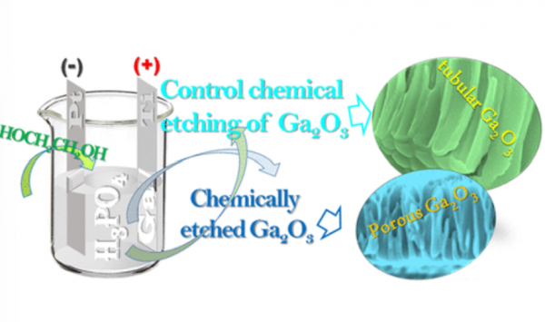 The present work demonstrates the formation of self-aligned nanoporous architecture of gallium oxide by anodization of gallium metal film controlled at −15 °C in aqueous electrolyte consisting of phosphoric acid. SEM examination of the anodized film reveals that by adding ethylene glycol to the electrolyte and optimizing the ratio of phosphoric acid and water, chemical etching at the oxide/electrolyte interfaces can be controlled, leading to the formation of aligned nanotubular oxide structures with closed bottom. XPS analysis confirms the chemical composition of the oxide film as Ga2O3. Further, XRD and SAED examination reveals that the as-synthesized nanotubular structure is amorphous, and can be crystallized to β-Ga2O3 phase by annealing the film at 600 °C. The nanotubular structured film, when used as photoanode for photoelectrochemical splitting of water, achieved a higher photocurrent of about two folds than that of the nanoporous film, demonstrating the rewarding effect of the nanotubular structure. In addition, the work also demonstrates the formation of highly organized nonporous Ga2O3 structure on a nonconducting glass substrate coated with thin film of Ga-metal, highlighting that the current approach can be extended for the formation of self-organized nanoporous Ga2O3 thin film even on nonconducting flexible substrates.