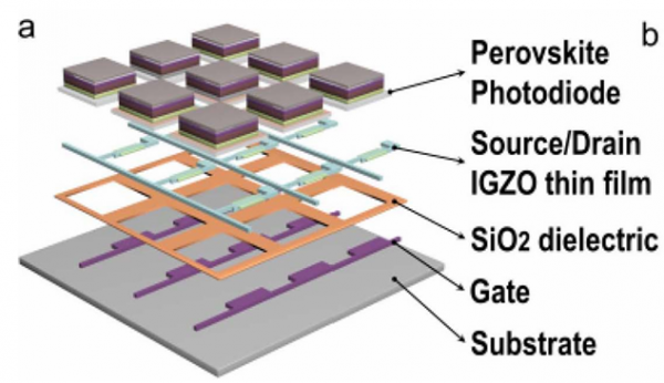 Pixellated perovskite photodiode on IGZO thin film transistor backplane for low dose indirect X-ray detection