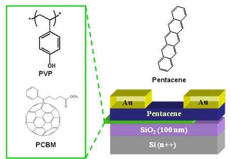 Here, we report on a pentacene-based, nonvolatile transistor memory device with poly(4-vinyl phenol) (PVP):[6,6]-phenyl-C61 butyric acid methyl ester (PCBM) nano-composite films as the charge storage site. Incorporation of PCBM molecules into PVP dielectric materials as charge storage sites for electrons resulted in a reversible shift in the threshold voltage (VTh) and reliable memory characteristics. The characteristics of the pentacene memory device were as follows: a relatively high field-effect mobility (µFET) (0.2–0.3 cm2 V-1 s-1) with a large memory window (ca. 20 V), a high on/off ratio (∼104) during writing and erasing with application of an operating gate voltage of 60 V for a short duration time (∼1 ms), and a retention time of about 40 h.