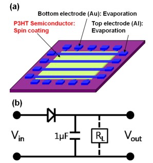 In this study, organic Schottky diodes were fabricated via a printing process. P3HT was used as an organic semiconductor material, and the variations in the electric characteristics of the diodes with the thickness of the thin film were analyzed. The on/off current ratio was 3.93 × 102 at ±5 V, and the off current at -5 V was 1.15 × 10−6 A. The on current decreased as the thickness was increased. With an input AC voltage of 20 Vp−p, the output characteristic showed DC 5.3 V and DC 3.2 V at frequencies of 100 Hz and 1 MHz, respectively. As the input frequency was increased, the output DC voltage was decreased more drastically in thicker diodes than in thin diodes.