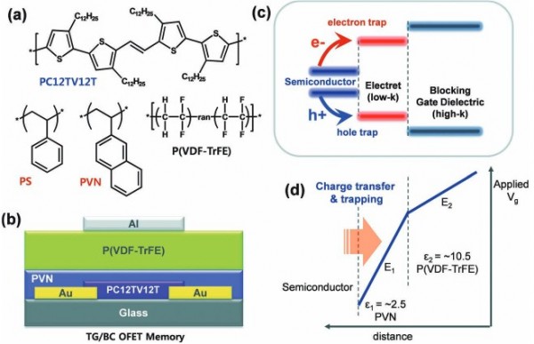High-performance top-gated organic field-effect transistor (OFET) memory devices using electrets and their applications to flexible printed organic NAND flash are reported. The OFETs based on an inkjet-printed p-type polymer semiconductor with efficiently chargeable dielectric poly(2-vinylnaphthalene) (PVN) and high-k blocking gate dielectric poly(vinylidenefluoride-trifluoroethylene) (P(VDF-TrFE)) shows excellent non-volatile memory characteristics. The superior memory characteristics originate mainly from reversible charge trapping and detrapping in the PVN electret layer efficiently in low-k/high-k bilayered dielectrics. A strategy is devised for the successful development of monolithically inkjet-printed flexible organic NAND flash memory through the proper selection of the polymer electrets (PVN or PS), where PVN/- and PS/P(VDF-TrFE) devices are used as non-volatile memory cells and ground- and bit-line select transistors, respectively. Electrical simulations reveal that the flexible printed organic NAND flash can be possible to program, read, and erase all memory cells in the memory array repeatedly without affecting the non-selected memory cells.