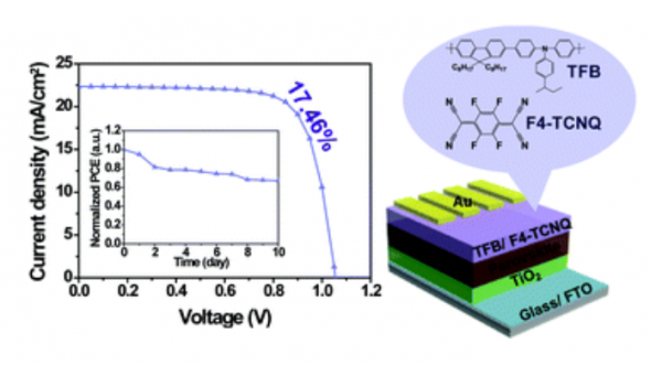 Designing an efficient and stable hole transport layer (HTL) material is one of the essential ways to improve the performance of organic–inorganic perovskite solar cells (PSCs). Herein, for the first time, an efficient model of a hole transport material (HTM) is demonstrated by optimized doping of a conjugated polymer TFB (poly[(9,9-dioctylfluorenyl-2,7-diyl)-co-(4,4′-(N-(4-sec-butylphenyl)diphenylamine)]) with a non-hygroscopic p-type dopant F4-TCNQ (2,3,5,6-tetrafluoro-7,7,8,8-tetracyanoquinodimethane) for high-efficiency PSCs. The PSC with the F4-TCNQ doped TFB exhibits the best power conversion efficiency (PCE) of 17.46%, which surpasses that of the reference devices, i.e., 16.64 (LiTFSI + TBP-doped Spiro-OMeTAD as the HTM) and 11.01% (LiTFSI + TBP-doped TFB as the HTM). F4-TCNQ doped TFB was believed to favor efficient charge and energy transfer between the perovskite and the hole transport layer and to reduce charge recombination as evidenced by steady-state photoluminescence (PL) and time-resolved photoluminescence (TRPL) analysis. Moreover, the hydrophobic nature of F4-TCNQ contributed to enhancing the stability of the device under ambient conditions with a RH of 45%. The device reported herein retained ca. 80% of its initial efficiency after 10 days, significantly superior to both LiTFSI + TBP-doped Spiro-OMeTAD (ca. 30%) and LiTFSI + TBP-doped TFB (ca. 10%) based counterparts. This simple yet novel strategy paves the way for demonstrating a promising route for a wide range of highly efficient solar cells and other photovoltaic applications.