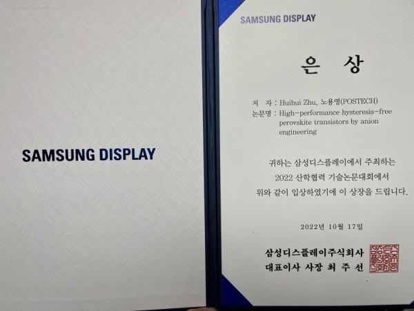 Huihui is awarded 삼성디스플레이 산학협력 논문대상: 은상 in 2022. 댓글 0건 조회 236회 작성일 2024-11-25 21:09 Hhuihui Zhu 학생이 2022 삼성디스플레이 산학협력 논문대상에서 '은상'을 수상하였습니다. 축하드립니다. 목록 이전글Ao is awarded GRC Poster Award in Gorden Research Conference: Unconventional Semiconductors and Their Applications 2022. 24.11.25 다음글Ji-Young is awarded Best Poster Award at KJF-ICOMEP 2022. 24.11.25
