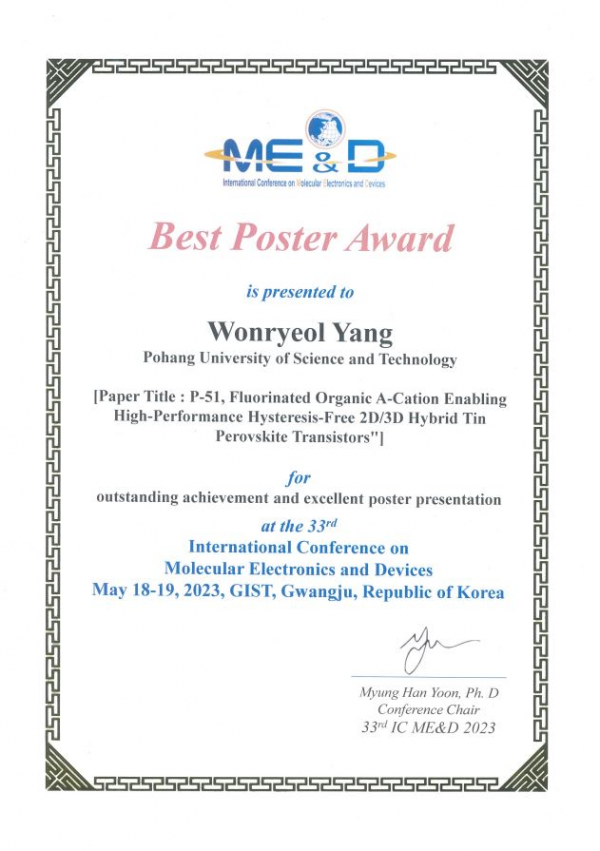 Wonryeol is awarded Best Poster Award at ICME&D 2023. 댓글 0건 조회 257회 작성일 2024-11-25 21:13 통합과정 양원렬 학생이 IC ME&D 2023 학회에서 'Best Poster Award' 을 수상하였습니다. 축하드립니다. 목록 이전글Geonwoong is awarded Best Poster Award at IMID 2023. 24.11.25 다음글Dr. Ao Liu is awarded 최우수인재상(장근수상) at graduation ceremony 2023. 24.11.25