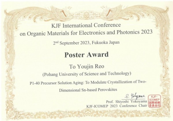 통합과정 노유진 학생이 2023 KJF International Conference on Organic Materials for Electronics and Photonics 2023에서 'Poster Award' 을 수상하였습니다.