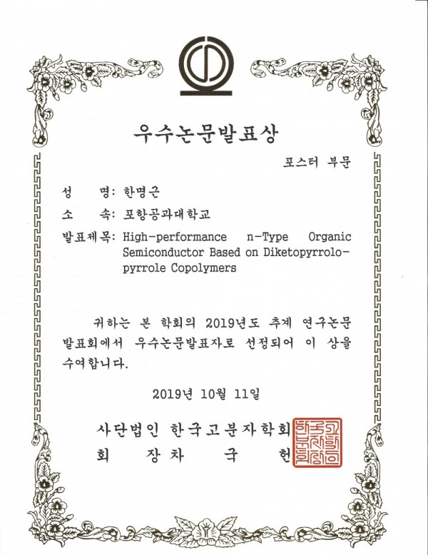 Myeonggeun is awarded 우수논문발표상 포스터부문 at 추계 고분자학회 2019. 댓글 0건 조회 213회 작성일 2024-10-23 10:47 박사과정 한명근 학생 (지도교수: 노용영)이 2019년도 추계 연구논문 발표회에서 '우수논문발표상 (포스터 부문)'을 수상하였습니다. 축하드립니다. 목록 이전글Ao is awarded Outstanding Poster Paper Award at IDW 2019. 24.10.23