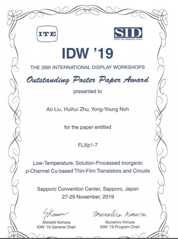 Ao is awarded Outstanding Poster Paper Award at IDW 2019. 댓글 0건 조회 199회 작성일 2024-10-23 10:48 박사과정 Ao Liu 학생이 <Outstanding Poster Paper Award>에서 수상을 하였습니다. 축하드립니다. 목록 이전글Huihui is awarded UDC Pioneering Technology Award at IMID 2020. 24.10.23 다음글Myeonggeun is awarded 우수논문발표상 포스터부문 at 추계 고분자학회 2019. 24.10.23