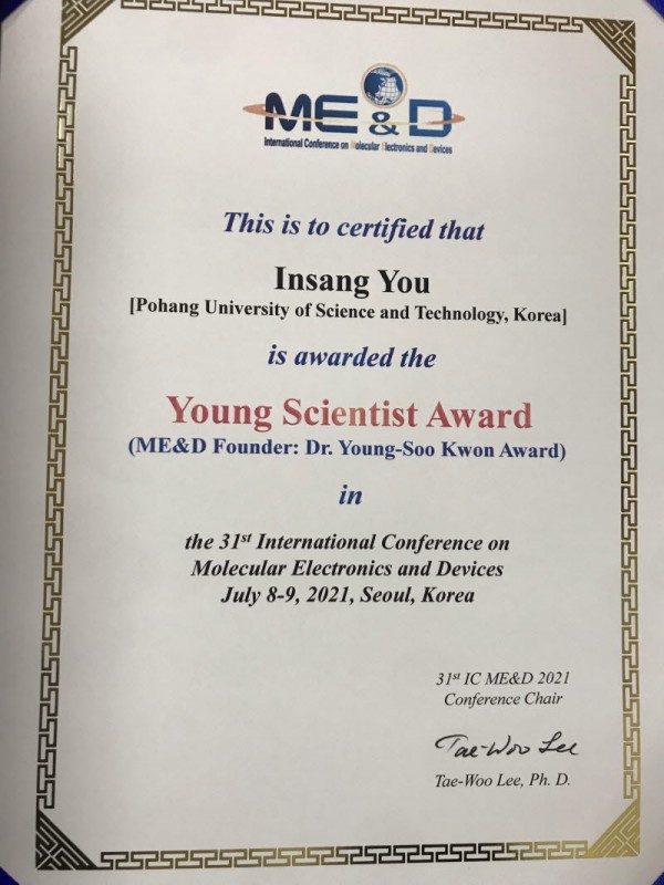 유인상 박사가 31st Intenational Confernece on Molecular Electronics and Devices에서 'Young Scientist Award'을 수상하였습니다.